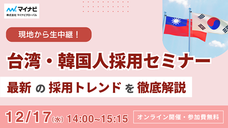 外国人採用セミナー 『台湾・韓国から生中継!最新の採用トレンドを徹底解説』 【台湾】 ・台湾の最新就職事情 ・現地から見た台湾人の日本就職への意欲 ・台湾人を採用する際のポイント 【韓国】 ・雇用市場における日本と韓国の違い ・韓国国内の就職事情と日本就職への意識の変化 ・韓国人採用を成功させるための有効な採用戦略 ※上記内容は、予告なく変更される場合がございますので予めご了承ください。 登壇者: 台湾マイナビ(Taiwan Mynavi Corporation) 董事長 張 聖豪 株式会社マイナビコリア 取締役 山口 芙美 |